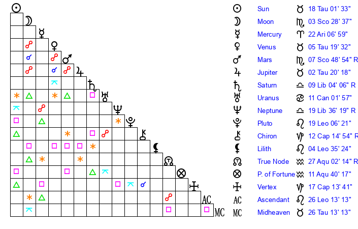 | Sun | 18 Taurus 1 | 18 Taurus 21 | 27 Cancer 53 |