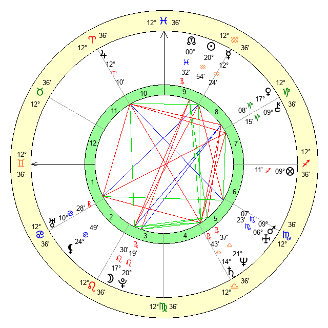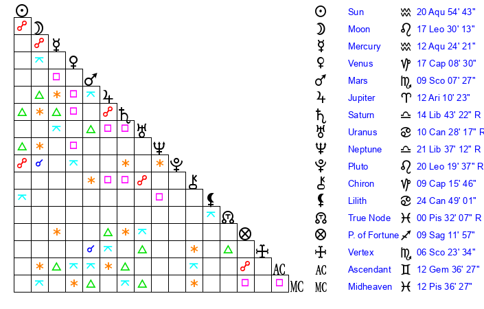| Sun | 20 Aquarius 54 | 22 Aquarius 12 | 3 Taurus 28 |