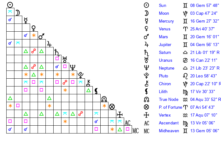 | Mercury | 16 Gemini 28 | 10 Gemini 12 | 29 Cancer 22 |