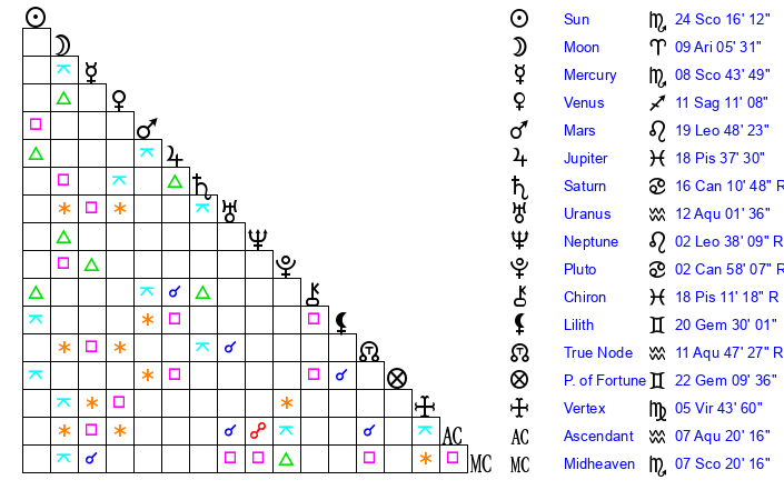 | Sun | 24 Scorpio 16 | 25 Scorpio 36 | 15 Pisces 48 |