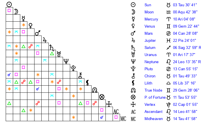 | Uranus | 1 Aries 18 | 25 Taurus 59 | 3 Aries 13 |