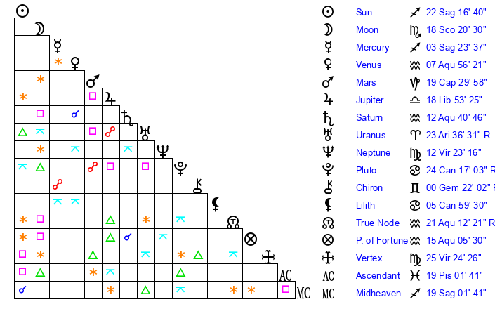 | Moon | 18 Scorpio 22 | 14 Gemini 22 | 27 Pisces 6 |