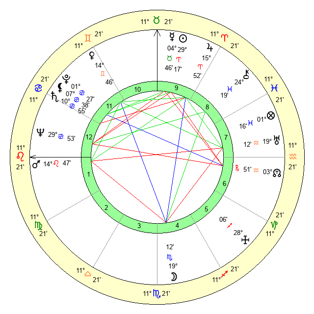 | Sun | 29 Aries 17 | 29 Aries 53 | 13 Leo 51 |