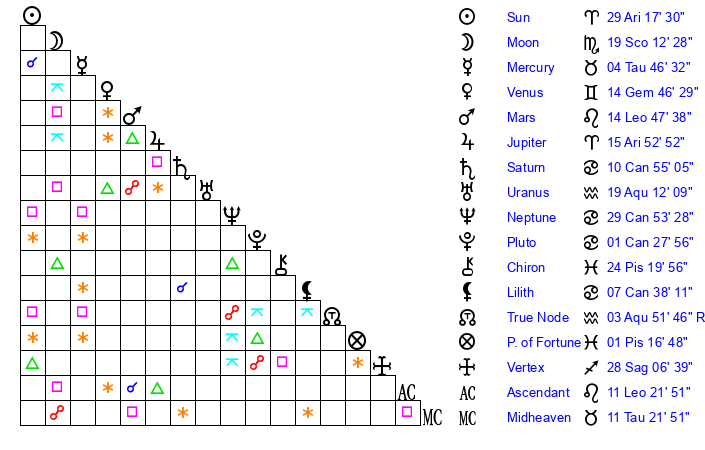 | Moon | 19 Scorpio 11 | 13 Capricorn 43 | 11 Scorpio 38 |