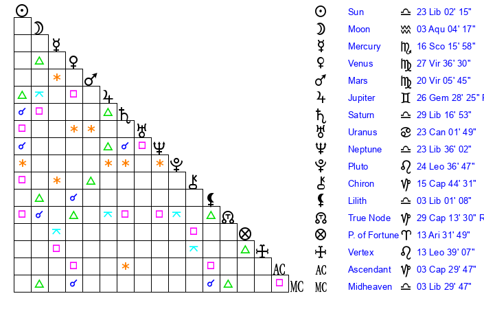 | Saturn | 29 Libra 45 | 26 Pisces 32 | 7 Scorpio 37 |
