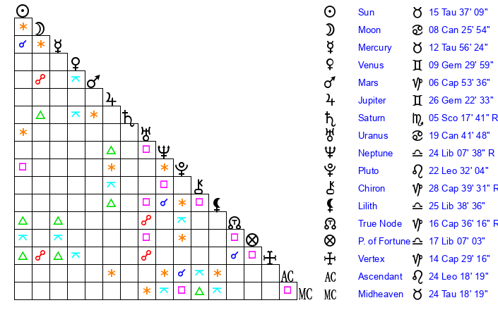 | Sun | 15 Taurus 37 | 16 Taurus 25 | 23 Cancer 36 |