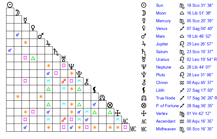 | Sun | 18 Scorpio 31 | 19 Scorpio 33 | 29 Capricorn 37 |