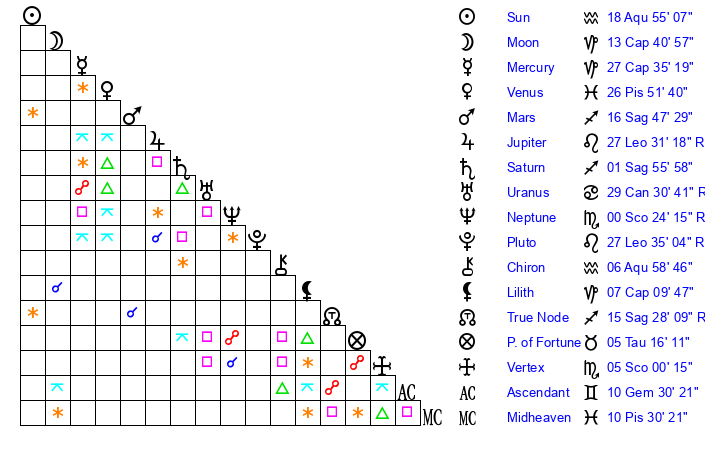 | Sun | 18 Aquarius 55 | 20 Aquarius 11 | 27 Aries 38 |