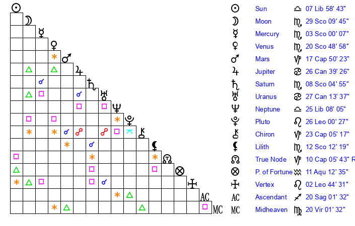 | Moon | 29 Scorpio 15 | 28 Capricorn 27 | 12 Cancer 6 |