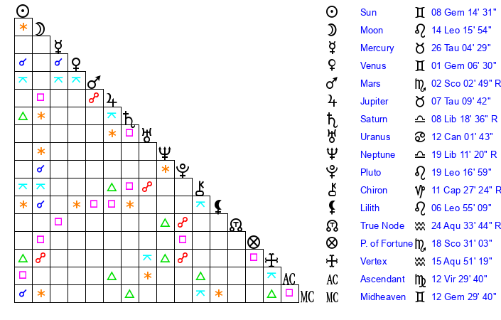 | Sun | 8 Gemini 14 | 8 Gemini 34 | 17 Leo 58 |