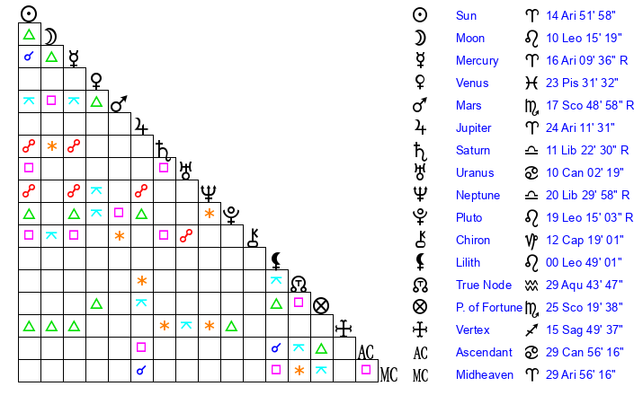 | Sun | 14 Aries 52 | 15 Aries 10 | 25 Gemini 27 |