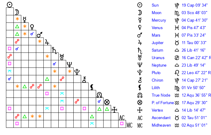 | Venus | 4 Pisces 47 | 20 Capricorn 10 | 1 Taurus 20 |