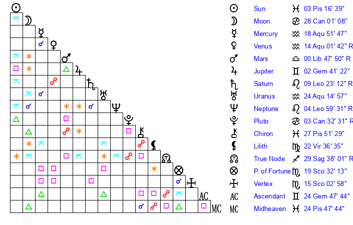 | Sun | 3 Pisces 16 | 4 Pisces 19 | 18 Gemini 1 |