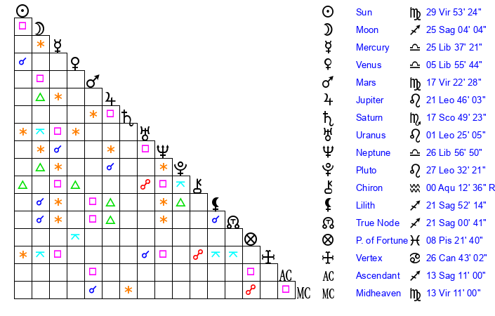 | Sun | 29 Virgo 53 | 0 Libra 55 | 9 Sagittarius 44 |