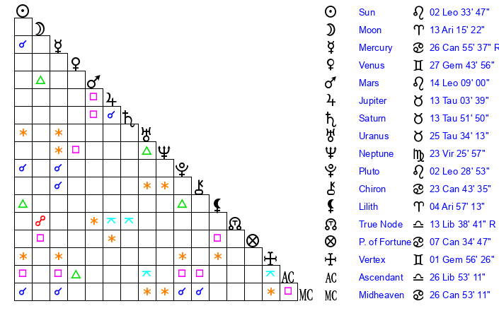 | Moon | 13 Aries 12 | 14 Leo 26 | 21 Taurus 0 |