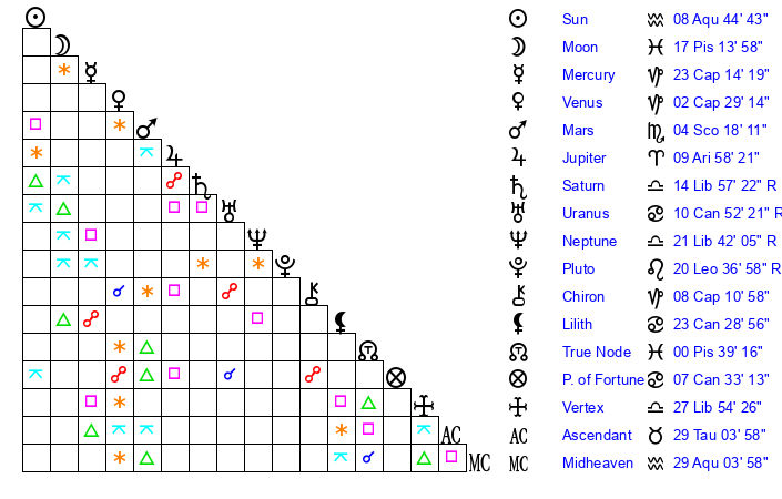 | Neptune | 21 Libra 42 | 27 Pisces 54 | 20 Libra 18 |