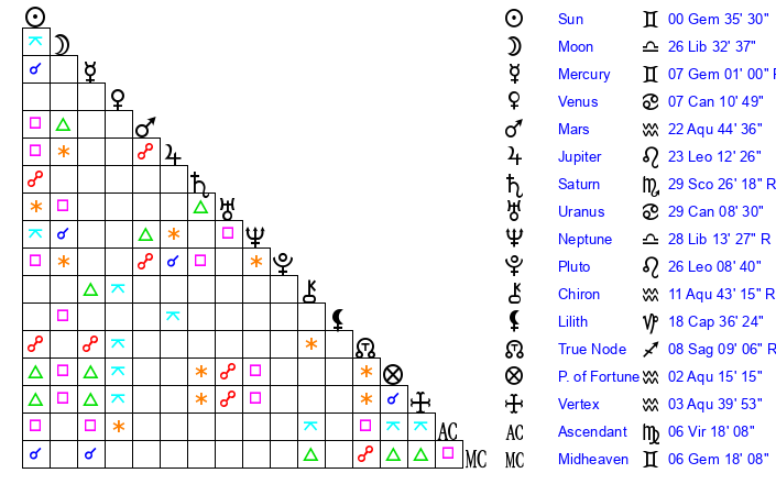 | Moon | 26 Libra 27 | 16 Pisces 12 | 23 Aries 2 |