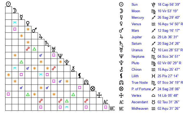 | Pluto | 1 Virgo 59 | 2 Aquarius 59 | 0 Virgo 25 |