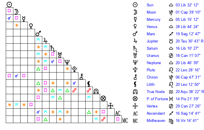 | Saturn | 16 Libra 39 | 27 Pisces 58 | 24 Libra 57 |