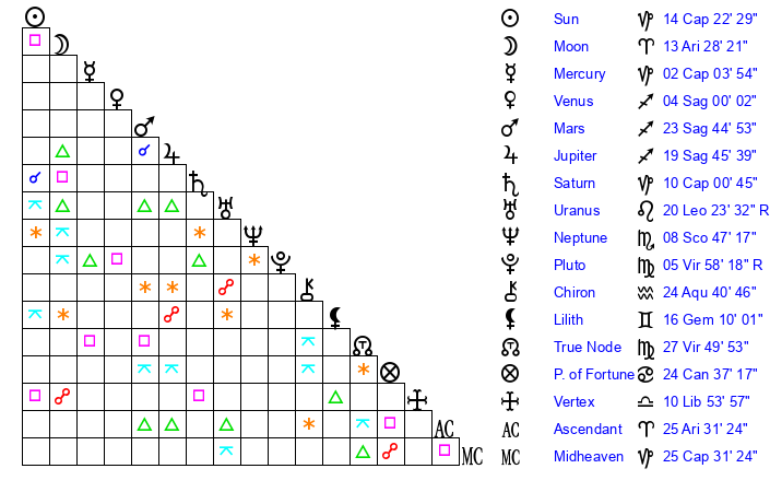 | Saturn | 10 Capricorn 19 | 14 Pisces 50 | 16 Capricorn 56 |