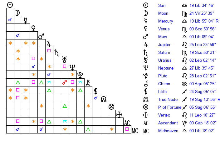| Neptune | 27 Libra 40 | 0 Aries 12 | 29 Libra 57 |