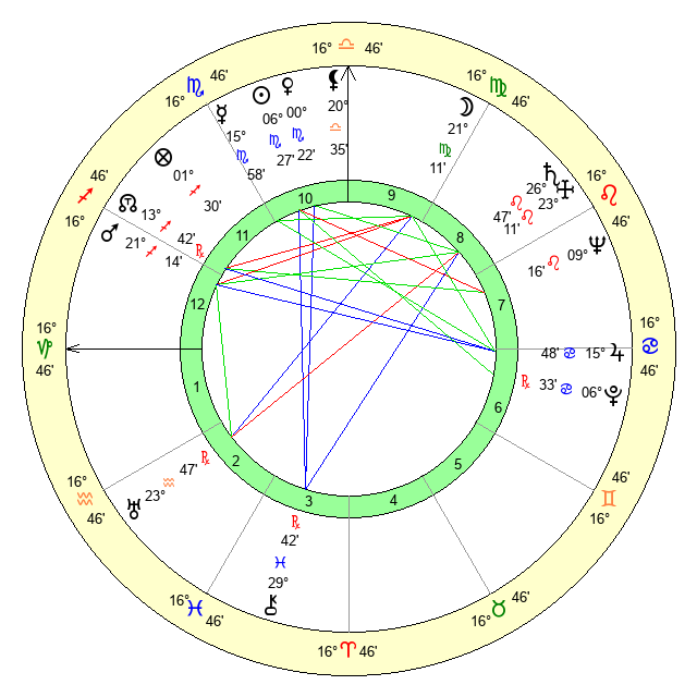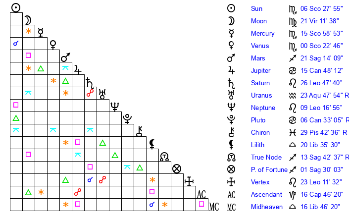 | Venus | 0 Scorpio 23 | 20 Libra 57 | 14 Pisces 39 |