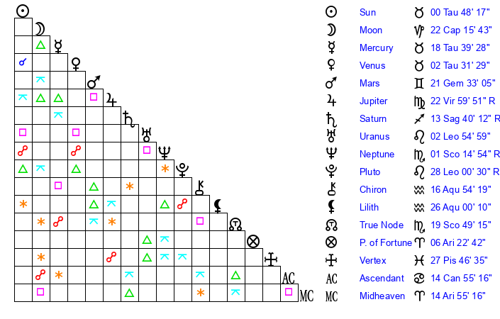 | Sun | 0 Taurus 48 | 1 Taurus 20 | 6 Cancer 12 |