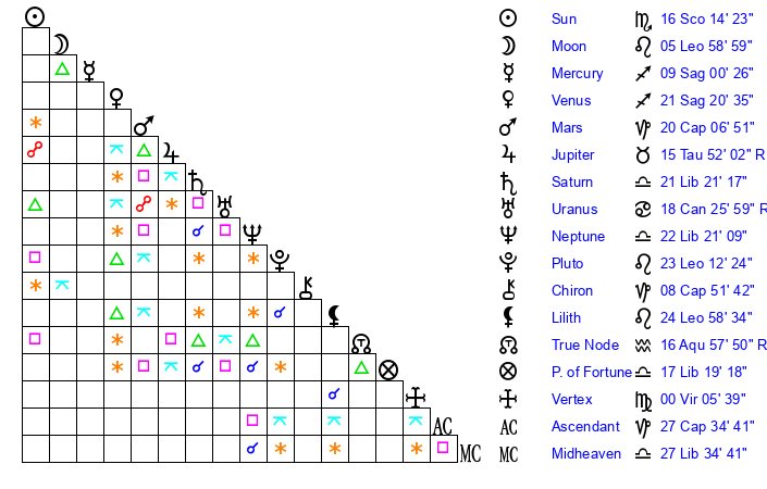 | Sun | 16 Scorpio 14 | 16 Scorpio 32 | 0 Aquarius 22 |