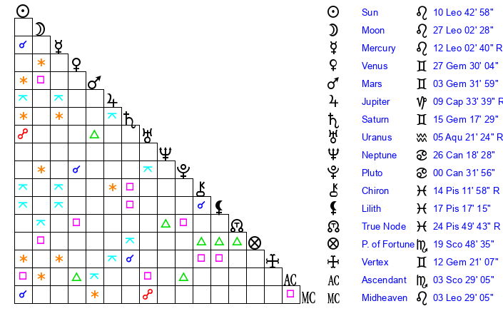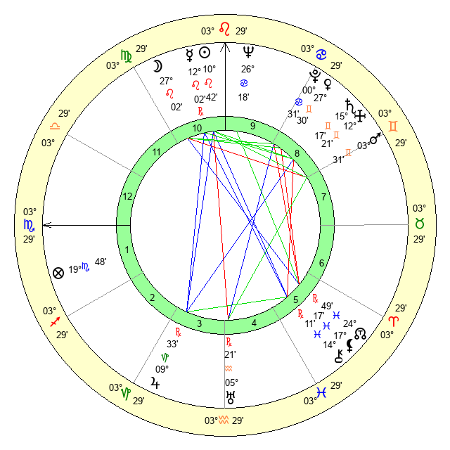 | Mercury | 12 Leo 2 | 7 Leo 4 | 29 Scorpio 44 |