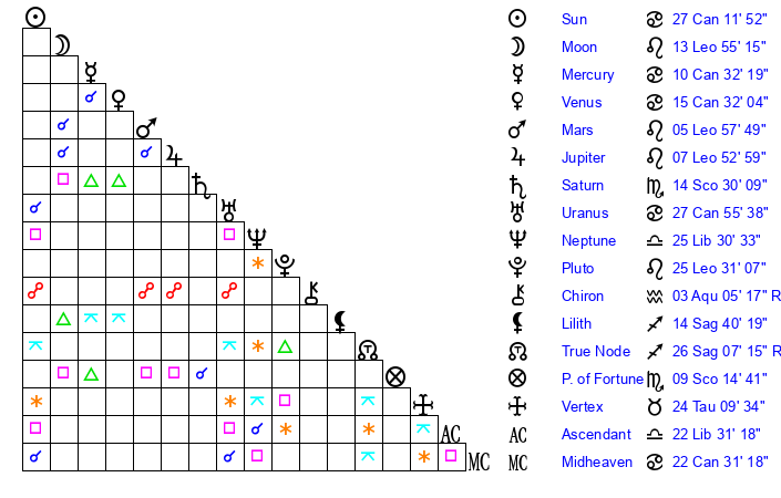 | Venus | 15 Cancer 32 | 18 Gemini 0 | 12 Libra 9 |
