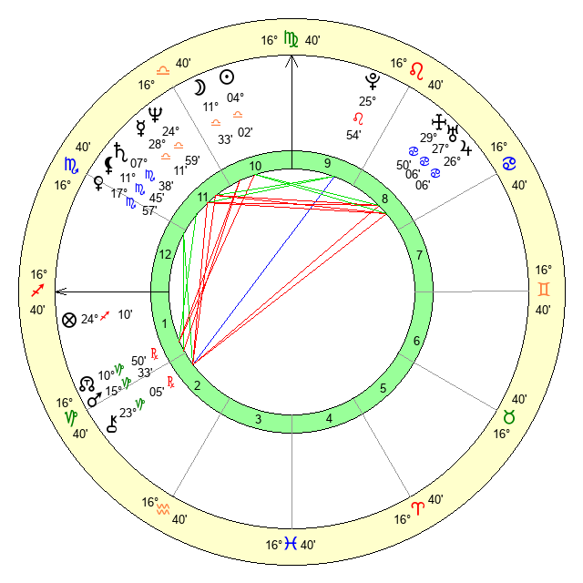 | Venus | 17 Scorpio 57 | 10 Virgo 1 | 14 Scorpio 43 |