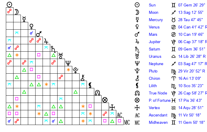 | Moon | 13 Sagittarius 17 | 29 Gemini 42 | 24 Scorpio 11 |