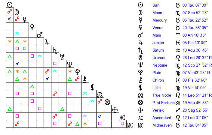 | Venus | 20 Taurus 37 | 25 Pisces 45 | 6 Leo 28 |