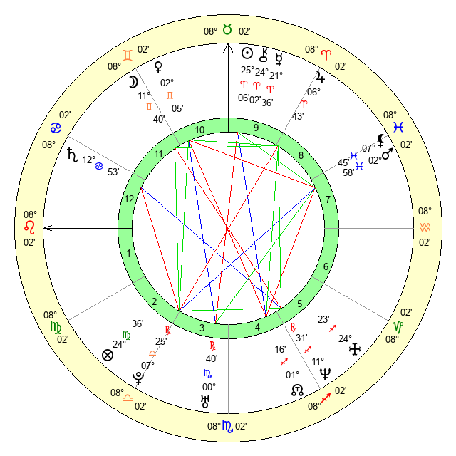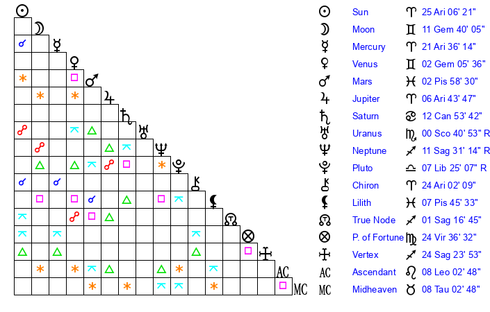 | Moon | 11 Gemini 45 | 25 Scorpio 10 | 13 Aries 23 |