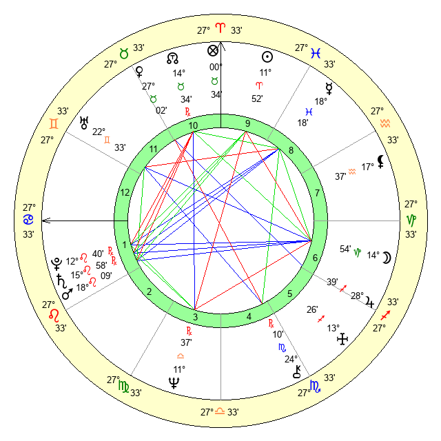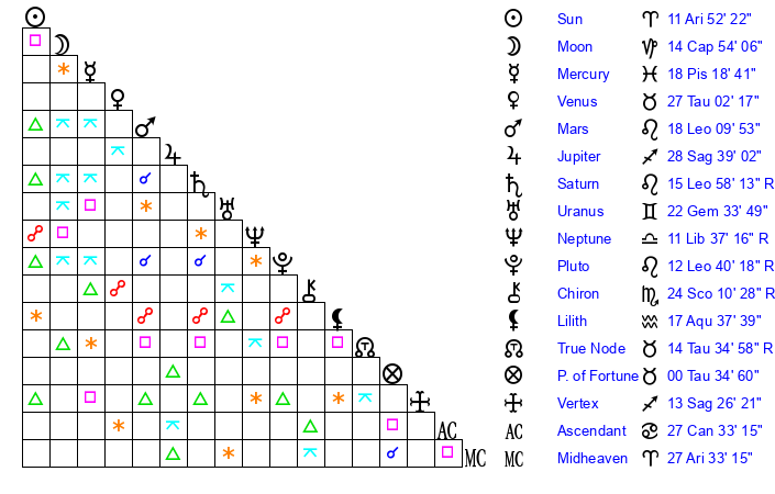 | Sun | 11 Aries 52 | 12 Aries 13 | 26 Gemini 22 |
