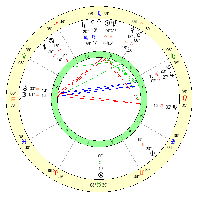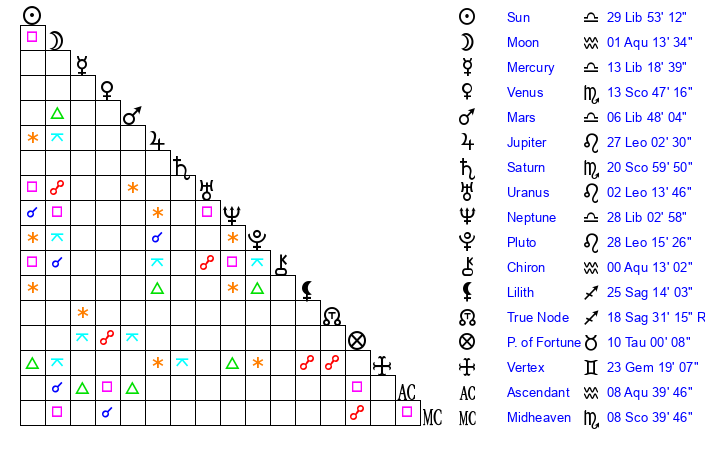 | Neptune | 28 Libra 3 | 29 Pisces 57 | 0 Scorpio 10 |