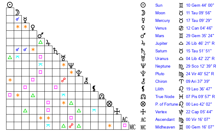 | Sun | 10 Gemini 44 | 11 Gemini 25 | 3 Leo 14 |