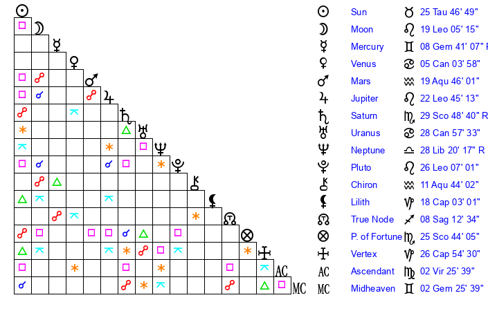 | Pluto | 26 Leo 6 | 3 Aquarius 46 | 27 Leo 24 |