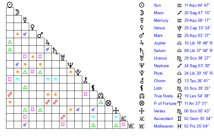 | Sun | 11 Aquarius 45 | 12 Aquarius 4 | 26 Pisces 1 |
