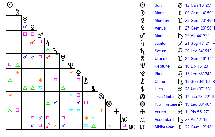 | Sun | 12 Cancer 21 | 12 Cancer 44 | 26 Virgo 24 |