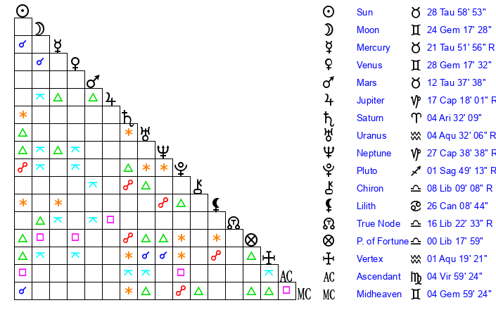 | Sun | 28 Taurus 59 | 28 Taurus 58 | 26 Gemini 45 |