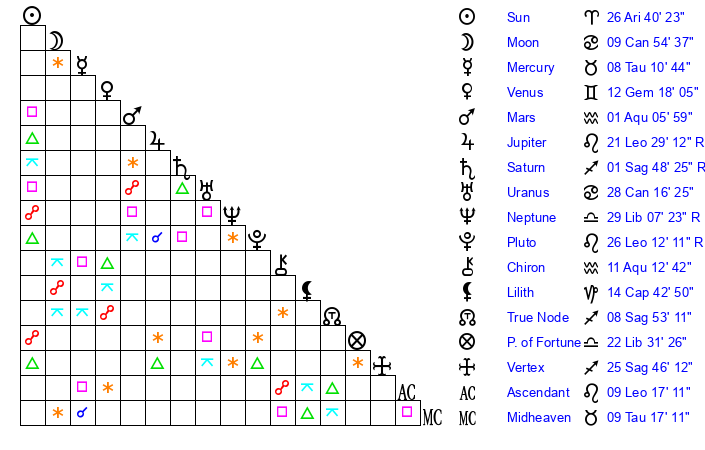 | Pluto | 26 Leo 11 | 3 Aquarius 44 | 26 Leo 37 |