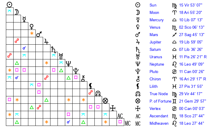 | Moon | 18 Aries 57 | 8 Aries 34 | 4 Aquarius 16 |