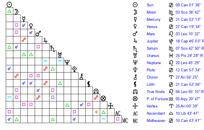 Moon | 3 Scorpio 32 | 24 Virgo 22 | 11 Cancer 49 |