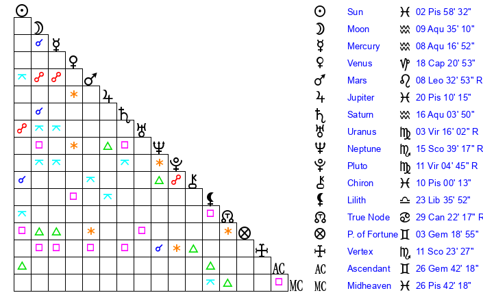 | Saturn | 16 Aquarius 18 | 19 Pisces 48 | 22 Aquarius 7 |