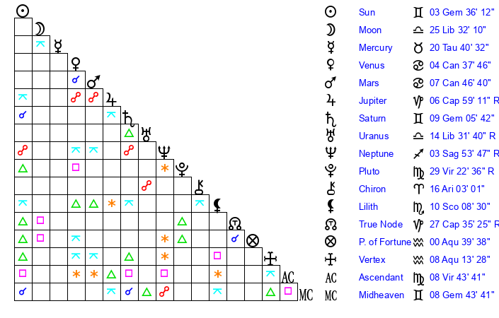 | Saturn | 9 Gemini 21 | 29 Pisces 52 | 15 Gemini 57 |