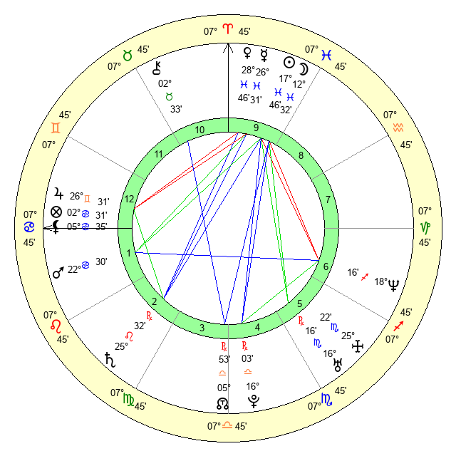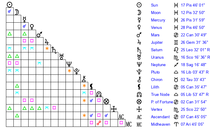 | Moon | 12 Pisces 33 | 13 Cancer 43 | 24 Scorpio 34 |