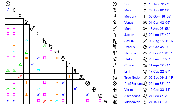 | Moon | 22 Taurus 11 | 28 Libra 28 | 10 Sagittarius 16 |
