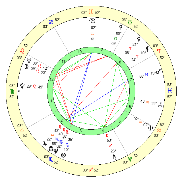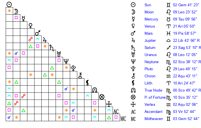 Sun | 2 Gemini 41 | 3 Gemini 27 | 6 Leo 41 |