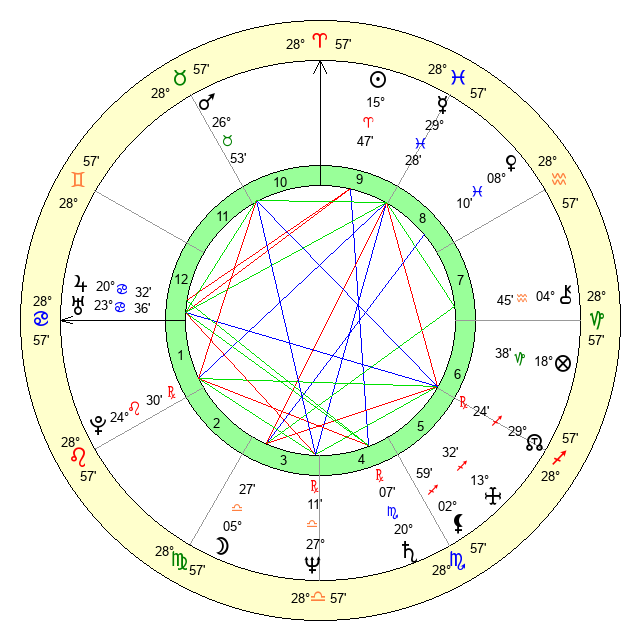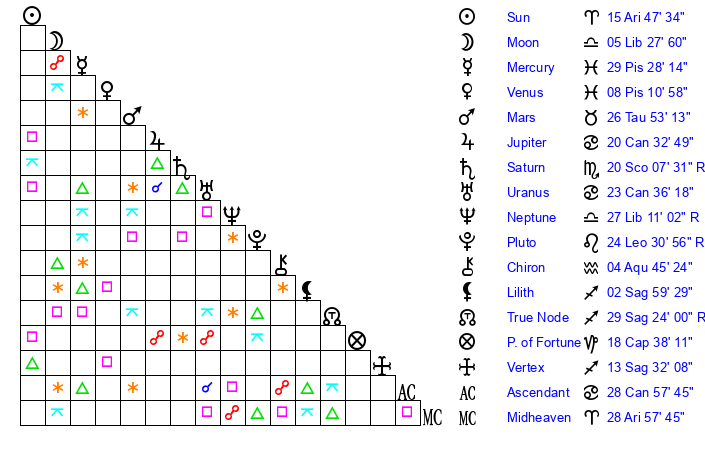| Moon | 5 Libra 21 | 2 Leo 27 | 16 Aries 54 |
